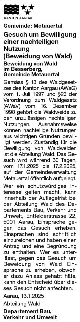 • Bauherrschaft und Projektverfasser: Viktor Zumsteg, Grossmatt 62, 5276 Wil AG; Grundeigentümer/in: Nicole Zumsteg, Grossmatt 62, 5276 Wil AG; Bauvorhaben: Quellfassung mit Brunnen und Stützmauer (nachträgliches Baugesuch); Standort: Parzelle Nr. 559, Kahalde, 5276 Wil AG; Zone: Landwirtschaftszone.; • Bauherrschaft und Grundeigentümer/in: Fischerzunft der Stadt Laufenburger, Oberdorfstrasse 3, 5074 Eiken; Projektverfasser/in: Heinz Lützelschwab, Oberdorfstrasse 3, 5074 Eiken; Bauvorhaben: Gerätelager, ToiToi, Pergola, Zelt und Umnutzung Gebäude Nr. 606 in Vereinslokal (nachträgliches Baugesuch); Standort: Parzelle Nr. 1075, 5275 Etzgen; Zone: ausserhalb der Bauzone (Sperrzone Rheinuferschutzdekret (RhD). Die Baugesuche liegen vom 17.01.2025 bis 17.02.2025 während den Bürostunden in der Gemeindeverwaltung Mettauertal öffentlich zur Einsichtnahme auf. Die Auflagefrist kann nicht verlängert werden. Eine schriftliche Einwendung gegen die Baugesuche ist während der Auflage beim Gemeinderat Mettauertal einzureichen. Die Einwendung muss vom Einsprecher selbst oder von einer von ihm bevollmächtigten Person verfasst und unterzeichnet werden. Sie hat einen Antrag und eine Begründung zu enthalten, d. h., es ist anzugeben, welchen Entscheid der Einsprecher anstelle der nachgesuchten Baubewilligung beantragt, und es ist darzulegen, aus welchen Gründen der Einsprecher diesen anderen Entscheid verlangt. Auf eine Einwendung, die diesen Anforderungen nicht entspricht, kann nicht eingetreten werden. Gemeindekanzlei